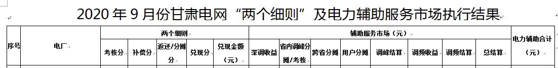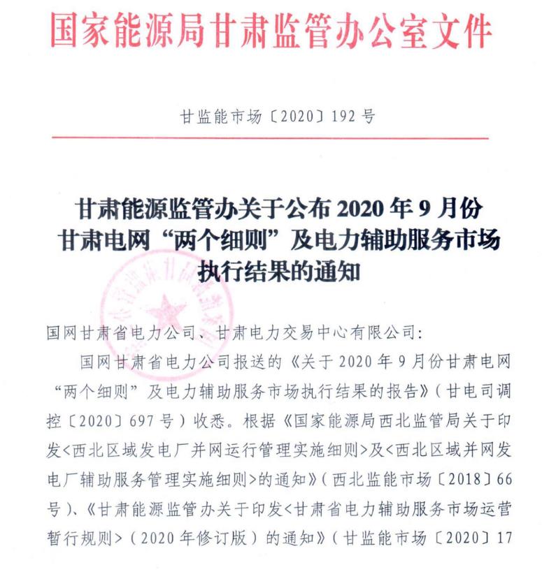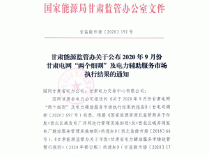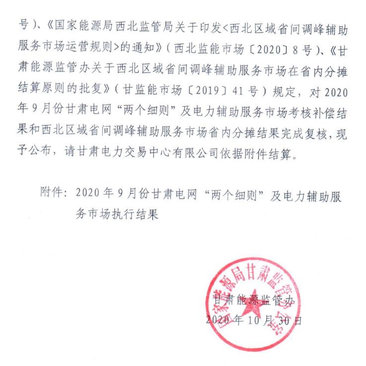 日前,甘肅能源監(jiān)管辦印發(fā)關(guān)于公布2020年9月份甘肅電網(wǎng)“兩個(gè)細(xì)則”及電力輔助服務(wù)市場(chǎng)執(zhí)行結(jié)果的通知,詳情如下: