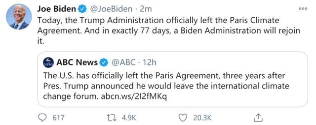 美國(guó)于11月4日正式退出具有里程碑意義的《巴黎協(xié)定》!敖裉,特朗普政府正式退出了巴黎氣候協(xié)定。77天之后,拜登政府將重新加入!碑(dāng)晚,美國(guó)民主黨總統(tǒng)候選人拜登在社交媒體上說道。截屏圖民主黨和共和黨在氣候變化立場(chǎng)上態(tài)度迥異,如果拜登當(dāng)選,美國(guó)聯(lián)邦層面的氣候政策將出現(xiàn)深刻的改變。拜登在競(jìng)選過程中提出了一系列改善氣候和環(huán)境問題