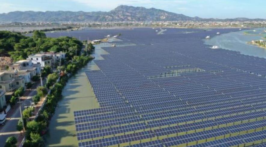 在漳州市漳浦鹽場竹嶼村,一片片光伏發(fā)電板樹立在海面上,于藍(lán)色海面交相輝映,在這里古法曬鹽工藝與光伏元素相結(jié)合,成了網(wǎng)紅景點(diǎn)。