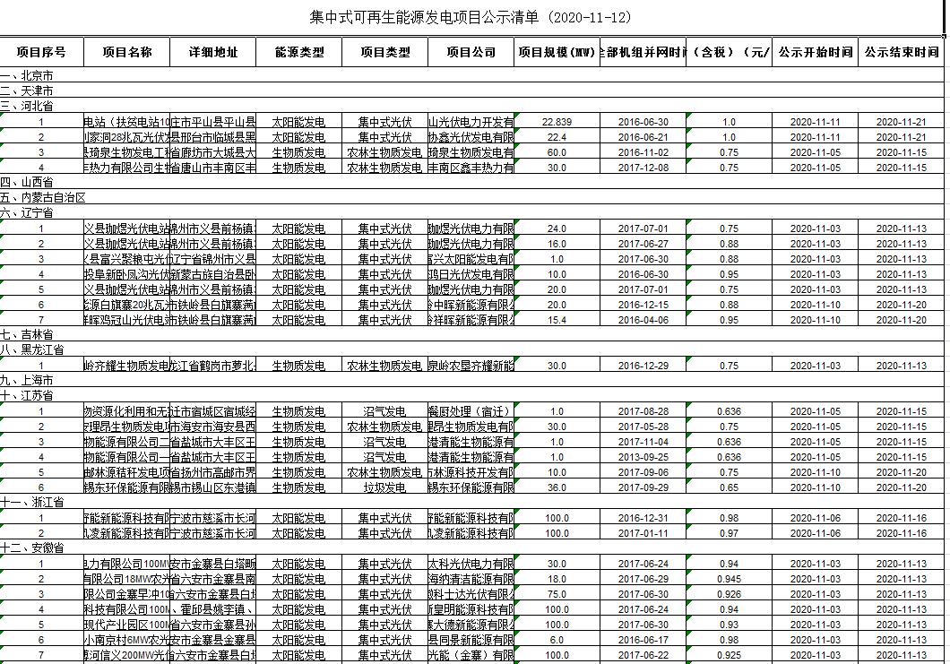 從國家電網(wǎng)獲悉:今日(11月12日),國網(wǎng)發(fā)布新一批集中式可再生能源發(fā)電項(xiàng)目公示清單,共計(jì)4個(gè),其中,集中式光伏項(xiàng)目56個(gè)。公示時(shí)間為11月11日至11月21日。詳情如下: