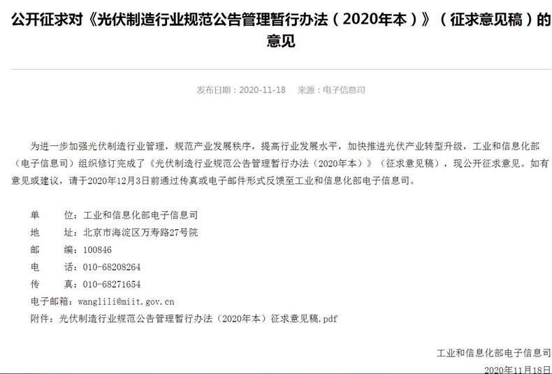 據(jù)工業(yè)和信息化部官網(wǎng)消息,為進一步加強光伏制造行業(yè)管理,規(guī)范產(chǎn)業(yè)發(fā)展秩序,提高行業(yè)發(fā)展水平,加快推進光伏產(chǎn)業(yè)轉(zhuǎn)型升級,工業(yè)和信息化部(電子信息司)組織修訂完成了《光伏制造行業(yè)規(guī)范公告管理暫行辦法(2020年本)》(征求意見稿)并公開征求意見。截止日期為2020年12月3日前。