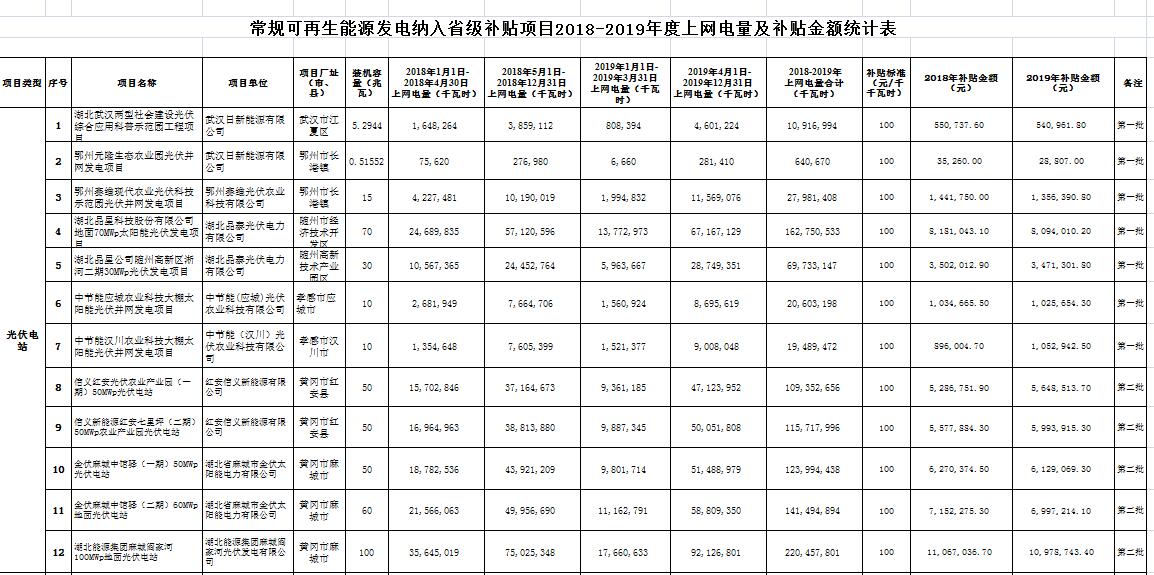 公示明確:根據(jù)《省物價(jià)局省能源局關(guān)于對(duì)新能源發(fā)電項(xiàng)目實(shí)行電價(jià)補(bǔ)貼有關(guān)問題的通知》(鄂價(jià)環(huán)資〔2015〕90號(hào))規(guī)定,結(jié)合我省新能源發(fā)電項(xiàng)目省級(jí)電價(jià)補(bǔ)貼資金籌集情況,我委組織國網(wǎng)湖北省電力公司對(duì)符合條件的新能源發(fā)電項(xiàng)目2018—2019年期間上網(wǎng)電量和電價(jià)補(bǔ)貼進(jìn)行了統(tǒng)計(jì)。初步認(rèn)定2018-2019年補(bǔ)貼資金共計(jì)64633.45萬元,其中集中式光伏電站21個(gè),補(bǔ)貼金額20555.65萬元;風(fēng)電項(xiàng)目33個(gè),補(bǔ)貼金額40049.96萬元;沼氣發(fā)電項(xiàng)目3個(gè),補(bǔ)貼金額0.0755萬元;非自然人分布式光伏發(fā)電項(xiàng)目298個(gè),補(bǔ)貼金額3764.78萬元;自然人分布式光伏發(fā)電項(xiàng)目586個(gè),補(bǔ)貼金額267.28萬元。