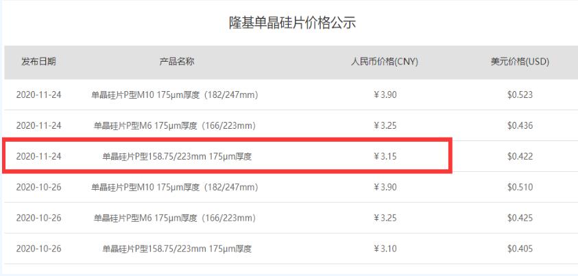 11月24日,隆基股份公布新一期硅片價格公示。國內(nèi)M6(166mm)、M10(182mm)尺寸硅片報價保持不變,分別為每片3.25元和3.90元。G1(158.75mm)尺寸硅片國內(nèi)報價較上月(3.10元/片)上漲至每片3.15元。