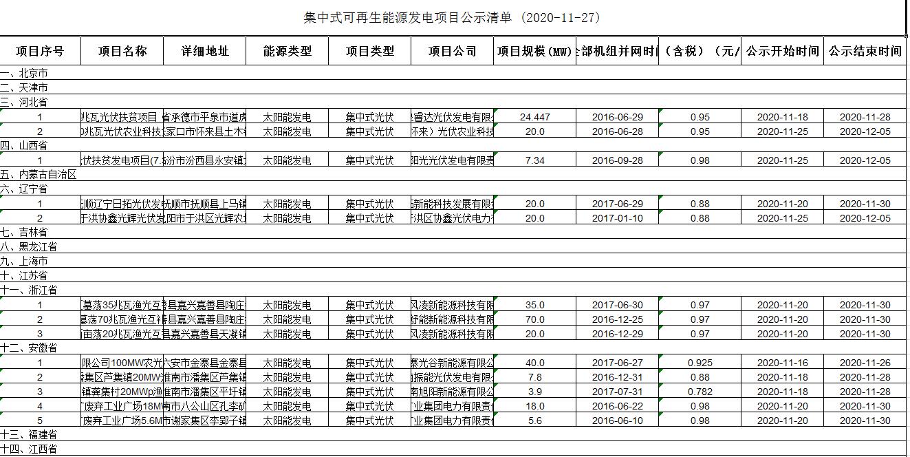 今日(11月27日),國(guó)家電網(wǎng)發(fā)布新一批集中式可再生能源發(fā)電項(xiàng)目公示清單,共計(jì)56個(gè),其中,集中式光伏項(xiàng)目44個(gè)。