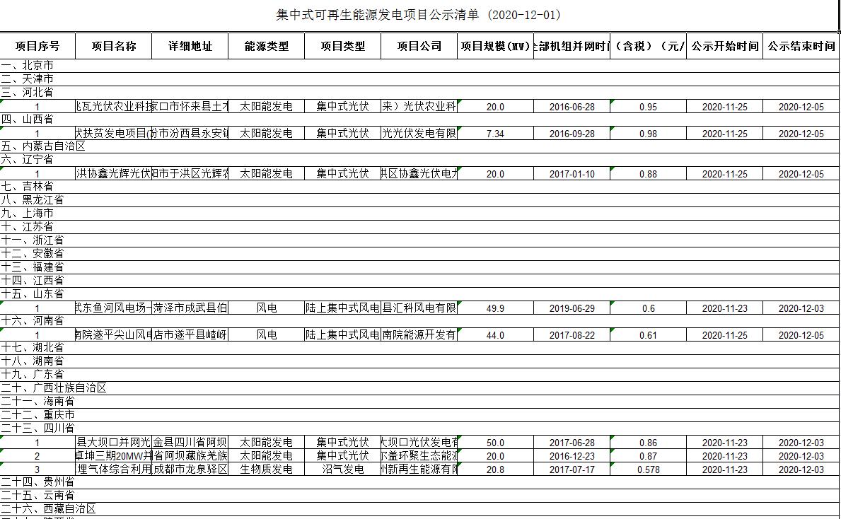 12月1日,國家電網(wǎng)發(fā)布新一批集中式可再生能源發(fā)電項目公示清單,共計16個,其中,集中式光伏項目12個。