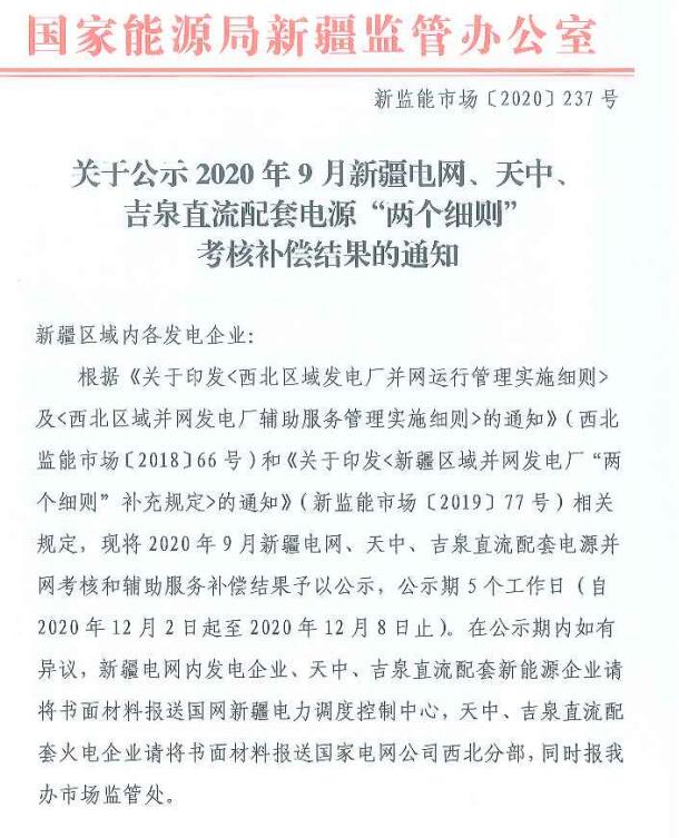 9月份新疆電網(wǎng)、天中、吉泉直流配套電源“兩個細(xì)則”考核補償結(jié)果公示