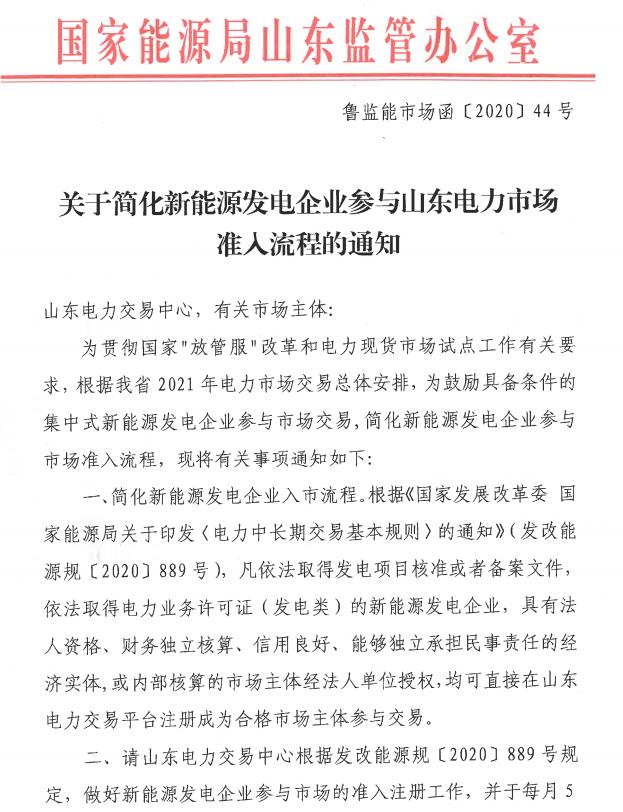 12月3日,從國家能源局山東監(jiān)管辦公室獲悉,根據(jù)山東省2021年電力市場交易總體安排,為鼓勵(lì)具備條件的集中式新能源發(fā)電企業(yè)參與市場交易,山東監(jiān)管辦發(fā)布《關(guān)于簡化新能源發(fā)電企業(yè)參與山東電力市場準(zhǔn)入流程的通知》(以下簡稱《通知》),明確簡化新能源發(fā)電企業(yè)入市流程具體要求和規(guī)定!锻ㄖ访鞔_,凡依法取得發(fā)電項(xiàng)目核準(zhǔn)或者