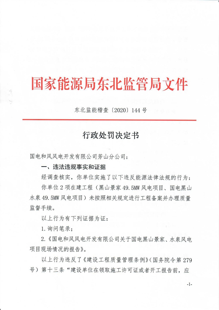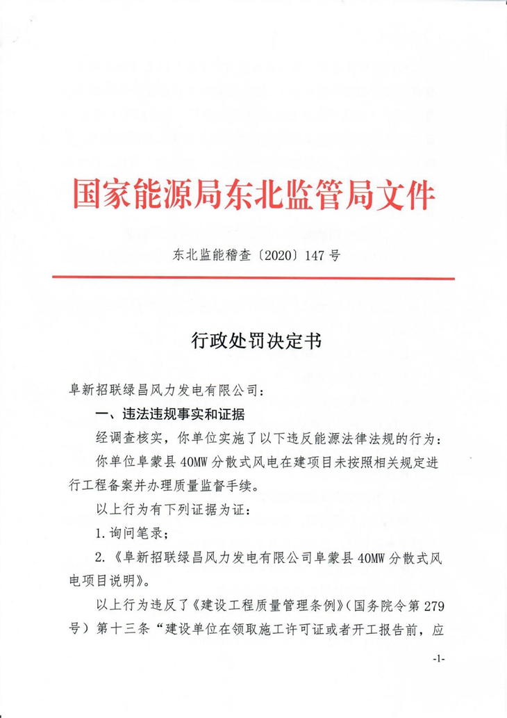 近日,國家能源局東北監(jiān)管局相繼發(fā)布四條行政處罰決定書,對違反能源法律法規(guī)的4家能源企業(yè)給予行政處罰,責令立即整改。分別為:大連東方國順能源科技有限公司,大連市普蘭店區(qū)樂甲街道網(wǎng)源友好型風電場示范項目;阜新市綠色絲路售電有限公司,阜蒙縣50MW分散式風電在建項目;阜新招聯(lián)綠昌風力發(fā)電有限公司,阜蒙40MW分