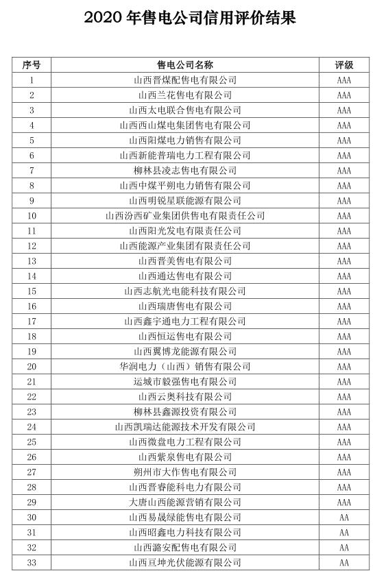 據(jù)山西省能源局消息:依據(jù)省能源局、省發(fā)展改革委、山西能監(jiān)辦聯(lián)合印發(fā)的《全省電力市場(chǎng)售電公司信用評(píng)價(jià)與風(fēng)險(xiǎn)防范管理辦法(試行)》,山西電力交易中心對(duì)全省售電公司開(kāi)展了信用評(píng)價(jià)工作,評(píng)價(jià)范圍為2020年6月底前在冊(cè)的售電公司(共231家),評(píng)價(jià)周期為2019年7月至2020年6月,現(xiàn)將信用評(píng)價(jià)結(jié)果予以公示。