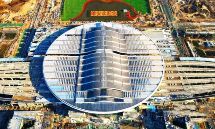 作為雄安新區(qū)開工建設的首個重大基礎設施項目,綠色發(fā)展的理念始終貫穿著雄安站的建設。雄安站站房外觀呈水滴狀橢圓造型,采用“青蓮滴露”的主題,設計理念以雄安水文化為靈感,橢圓形的屋蓋上,深藍色的多晶硅光伏組件從中間向兩側逐漸過渡,與屋面造型相輔相成,如同微風蕩漾時水面上泛起的層層漣漪。陽光照耀在光伏板上熠熠生輝,清潔的電能源源不斷地輸送到雄安站內(nèi)。