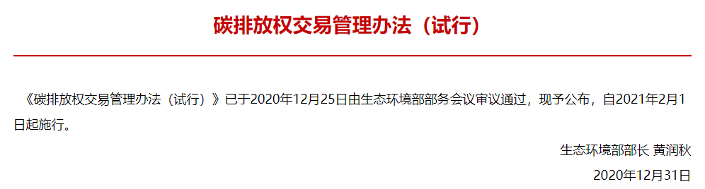 1月5日生態(tài)環(huán)境部消息,《碳排放權(quán)交易管理辦法(試行)》已于2020年12月25日由生態(tài)環(huán)境部部務(wù)會(huì)議審議通過(guò),現(xiàn)予公布,自2021年2月1日起施行。