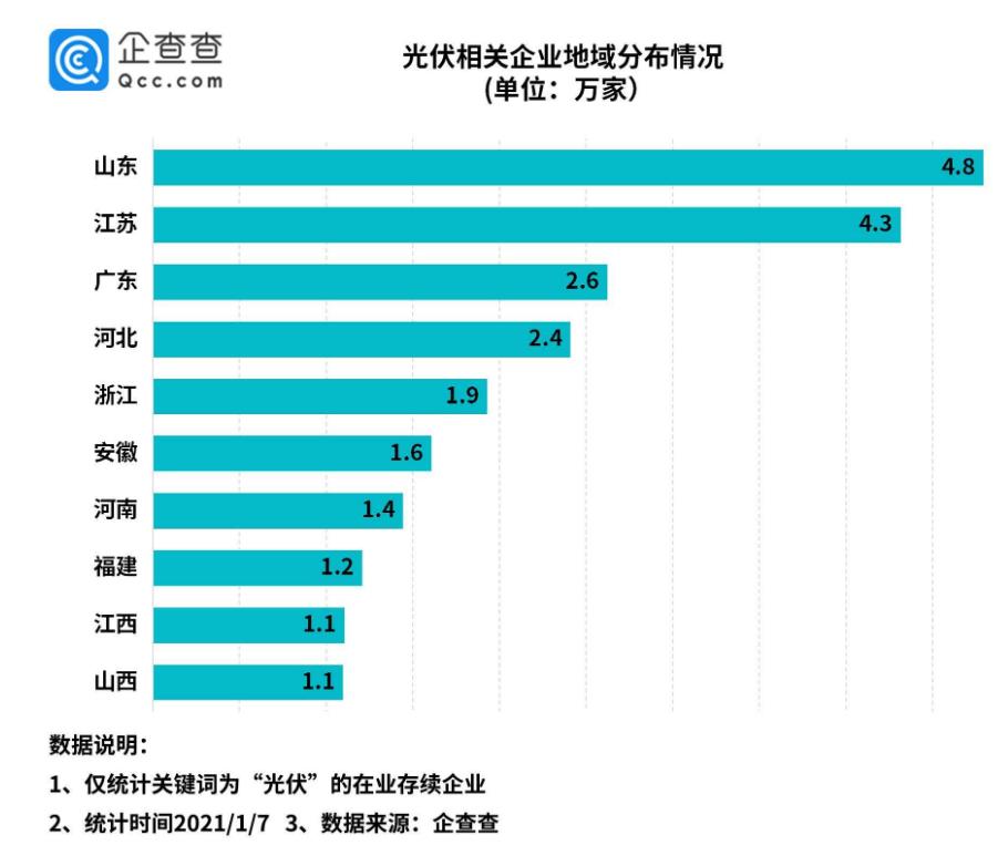 從地域上看,企查查數(shù)據(jù)顯示,山東和江蘇的光伏相關(guān)企業(yè)數(shù)量均超4萬家,排名前兩位,兩地光照資源豐富、農(nóng)戶密集,發(fā)展戶用光伏優(yōu)勢(shì)明顯。此外,廣東、河北、浙江分列三至五名。