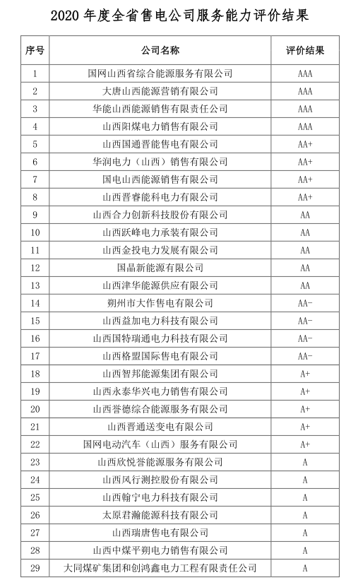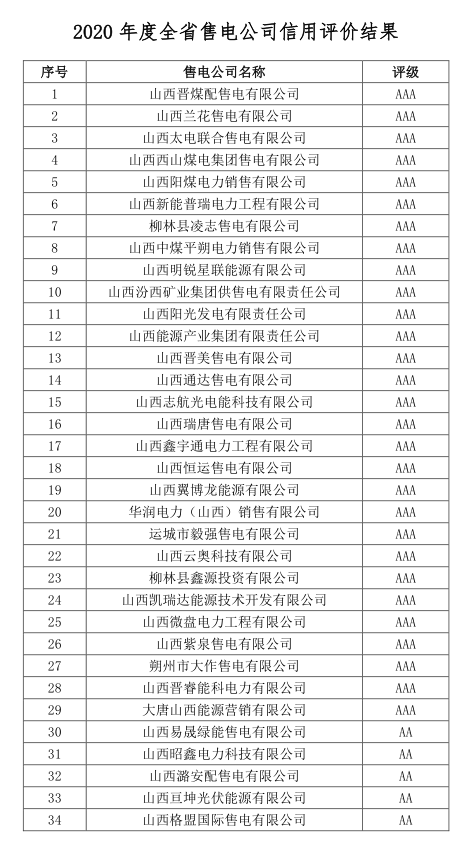 從山西省能源局獲悉:日前,山西省能源局發(fā)布2020年度全省電力市場售電公司信用評價和售電公司服務(wù)能力評價結(jié)果公告。