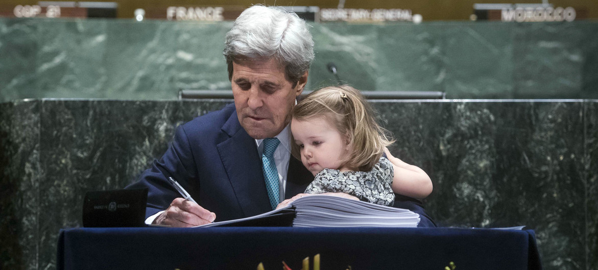 2016年4月,美國(guó)前國(guó)務(wù)卿約翰·克里在其孫女的陪同下,在聯(lián)合國(guó)總部簽署了《巴黎協(xié)定》。