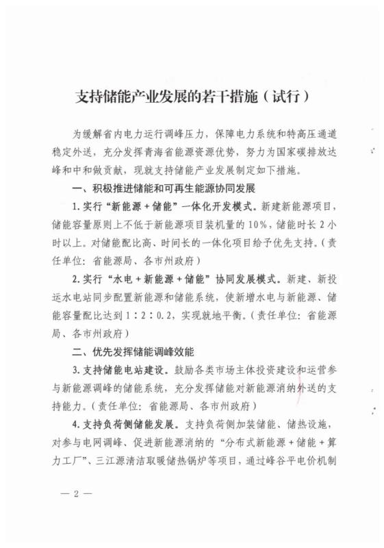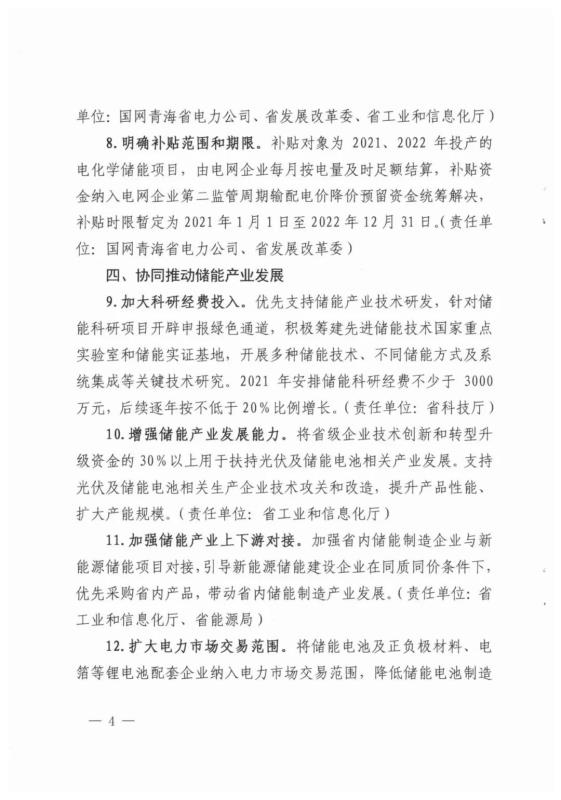 1月18日,青海省發(fā)改委、科技廳、工信廳、能源局聯(lián)合下發(fā)《關(guān)于印發(fā)支持儲能產(chǎn)業(yè)發(fā)展若干措施(試行)的通知》,對"新能源+儲能” 、"水電+新能源 + 儲能”項目中自發(fā)自儲設(shè)施所發(fā)售的省內(nèi)電網(wǎng)電量,給予每千瓦時0.10元運營補貼,如果經(jīng)省工業(yè)和信息化廳認(rèn)定使用本省產(chǎn)儲能電池60%以上的項目,在上述補貼基