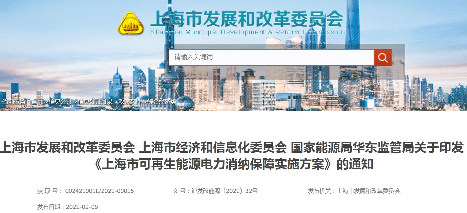 上海市發(fā)改委官網(wǎng)消息:2月9日,上海市發(fā)展和改革委員會、上海市經(jīng)信委、華東能監(jiān)局聯(lián)合發(fā)布《上海市可再生能源電力消納保障實施方案》。根據(jù)《實施方案》,2020年,上海市總量消納責(zé)任權(quán)重為32.5%,非水電消納責(zé)任權(quán)重為4.0%。