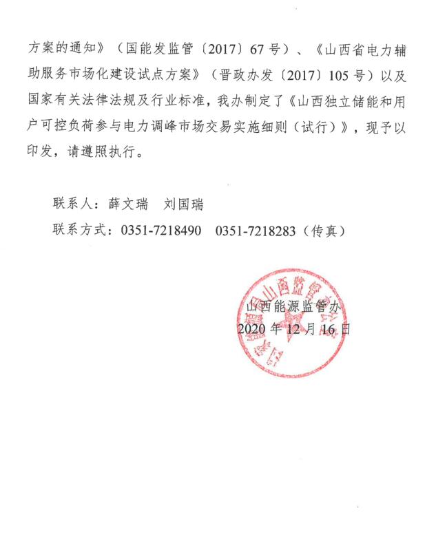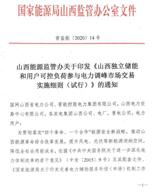 《山西獨立儲能和用戶可控負荷參與電力調(diào)峰市場交易實施細則(試行)》印發(fā)