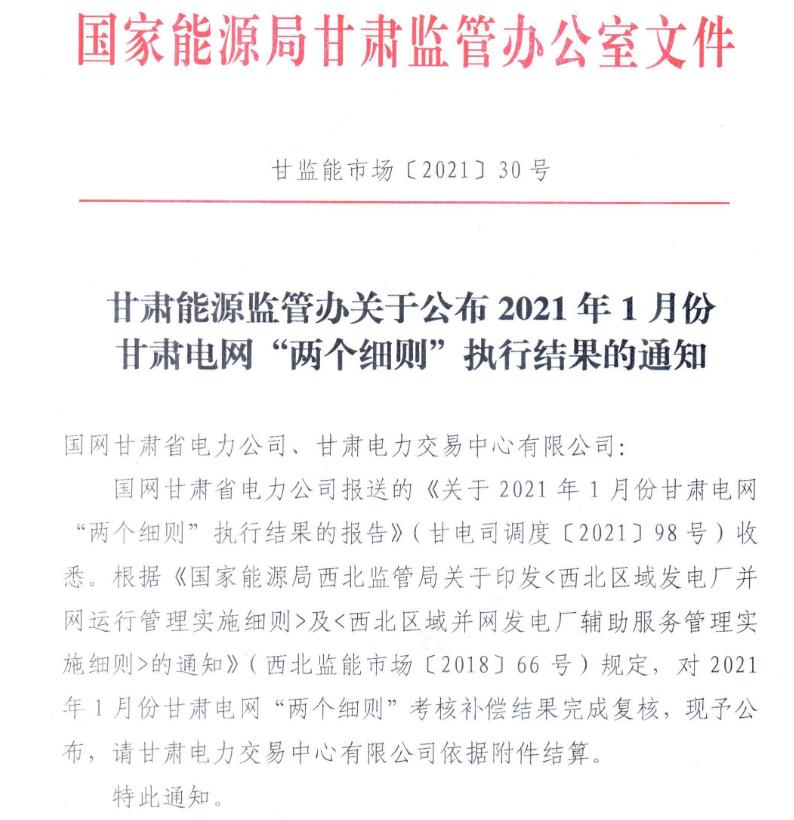 2021年1月份甘肅電網(wǎng)“兩個(gè)細(xì)則”執(zhí)行結(jié)果公布