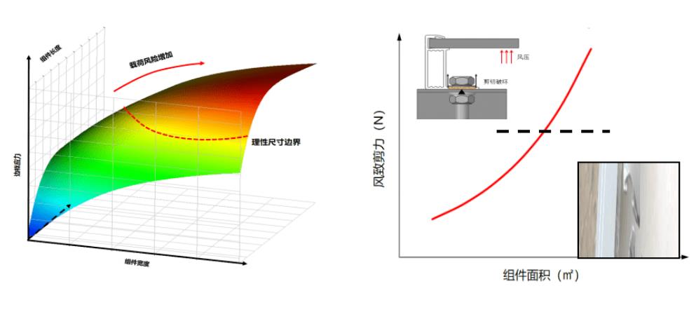 如下左圖所示,隨著組件長度、寬度的增大,邊框的應(yīng)力持續(xù)增加,超大尺寸組件面臨極高的應(yīng)力風(fēng)險(xiǎn)。另一方面,組件尺寸的加大將使其受到的風(fēng)、雪壓增大,邊框安裝點(diǎn)所受的剪切應(yīng)力相應(yīng)提高,邊框因風(fēng)載撕裂的風(fēng)險(xiǎn)顯著提高。此外,組件抗動(dòng)態(tài)機(jī)械載荷的能力將隨著尺寸變大而降低,加上超大尺寸組件所使用的超大玻璃目前尚未量產(chǎn)驗(yàn)證,這方面的風(fēng)險(xiǎn)也將更加不可控。
