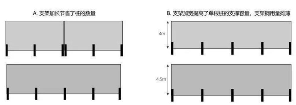 大尺寸組件所帶來的BOS成本降低主要來自支架與基礎(chǔ)成本的節(jié)省,其占比可達(dá)80%。而支架與基礎(chǔ)成本的節(jié)省本質(zhì)上源于大支架設(shè)計(jì)帶來的節(jié)省,包括長支架節(jié)省樁基礎(chǔ)數(shù)量,以及寬支架攤薄支架與基礎(chǔ)的單W成本。