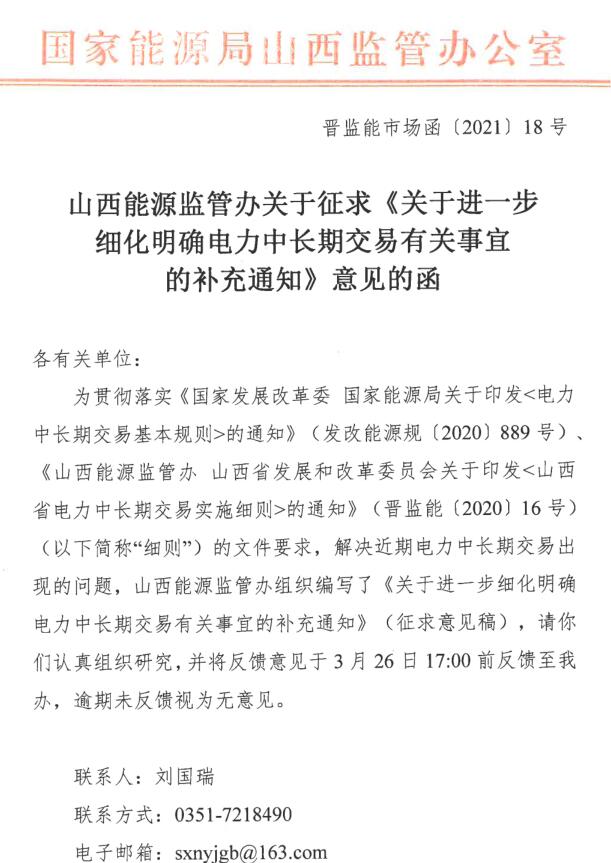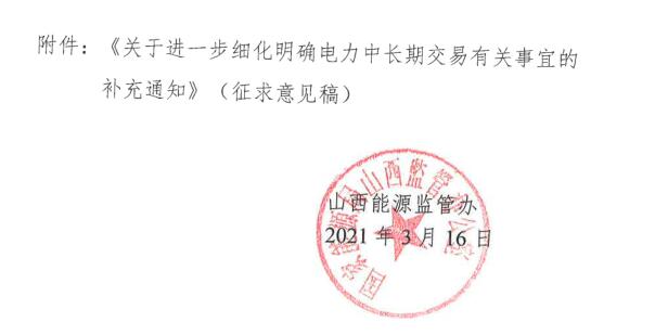 3月16日,山西能源監(jiān)管辦印發(fā)關于征求《關于進一步細化明確電力中長期交易有關事宜的補充通知》意見的函,全文如下: