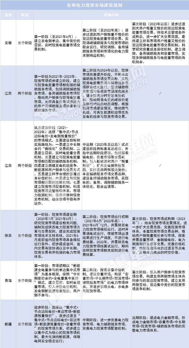 根據(jù)國(guó)家發(fā)改委、能源局的要求,除第一批電力現(xiàn)貨試點(diǎn)地區(qū)和西藏自治區(qū)外,各省(區(qū)、市)應(yīng)綜合考慮本地電力供需形勢(shì)、網(wǎng)源結(jié)構(gòu)、送受電情況、市場(chǎng)化基礎(chǔ)等條件,因地制宜研究編制電力現(xiàn)貨市場(chǎng)建設(shè)方案,也可考慮若干個(gè)地區(qū)聯(lián)合建立現(xiàn)貨市場(chǎng)的方案。據(jù)了解,從去年開(kāi)始,各地非試點(diǎn)省份的電力現(xiàn)貨市場(chǎng)建設(shè)力度加大,新疆、安徽、江蘇、江西、黑龍江、青海、陜西先后發(fā)布了電力現(xiàn)貨市場(chǎng)建設(shè)方案。未來(lái),還將有更多省份發(fā)布現(xiàn)貨市場(chǎng)建設(shè)方案。