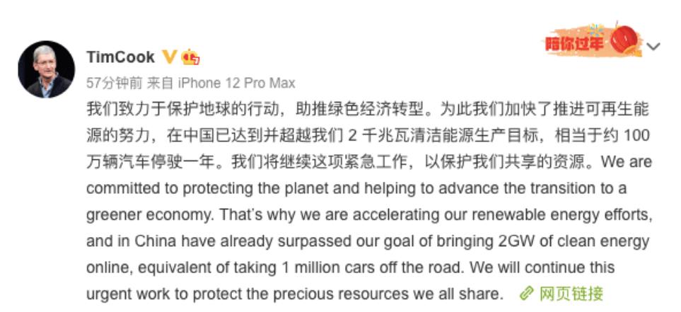 今日,蘋果CEO庫克發(fā)文表示,“我們致力于保護地球的行動,助推綠色經(jīng)濟轉(zhuǎn)型。為此我們加快了推進可再生能源的努力,在中國已達到并超越我們2千兆瓦清潔能源生產(chǎn)目標(biāo),相當(dāng)于約100萬輛汽車停駛一年。我們將繼續(xù)這項緊急工作,以保護我們共享的資源!