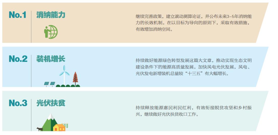 持續(xù)做好能源綠色轉(zhuǎn)型發(fā)展這篇大文章,推動(dòng)實(shí)現(xiàn)生態(tài)文明 建設(shè)條件下的能源高質(zhì)量發(fā)展。加快風(fēng)電光伏發(fā)展,風(fēng)電、 光伏發(fā)電新增裝機(jī)總量較“十三五”有大幅增長。 持續(xù)釋放能源惠民利民紅利,有效銜接脫貧攻堅(jiān)和鄉(xiāng)村振 興,繼續(xù)做好光伏扶貧收口工作。