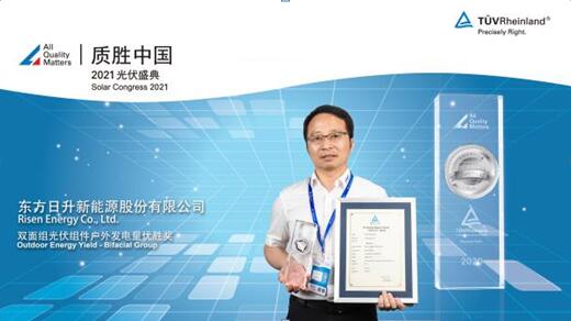 4月28日,由德國萊茵TUV集團(以下簡稱“TUV萊茵”)主辦的第七屆“質勝中國”光伏盛典暨“質勝中國優(yōu)勝獎”頒獎典禮在杭州召開。光伏龍頭企業(yè)東方日升受邀出席,并憑借雄厚的研發(fā)實力和高效的組件產品,榮膺“雙面組光伏組件戶外發(fā)電量優(yōu)勝獎”、“雙面異質結非疊瓦疊焊組綠色高效光伏組件轉換效率優(yōu)勝獎”兩項大獎。質勝中國