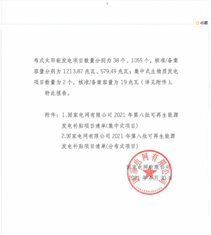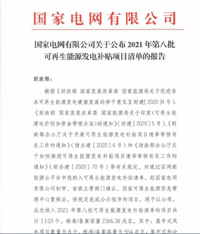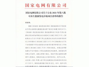 國(guó)家電網(wǎng)今日發(fā)布公告,公布2021年第八批可再生能源發(fā)電補(bǔ)貼項(xiàng)目清單。
