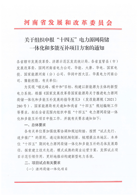 4月29日,河南省發(fā)改委下發(fā)《關于組織申報“十四五”電力源網(wǎng)荷儲一體化和多能互補項目方案的通知》,擬在全省范圍組織開展"十四五"電力源網(wǎng)荷儲一體化和多能互補發(fā)展項目申報工作,經(jīng)評估優(yōu)選后上報國家申請納入規(guī)劃范圍。