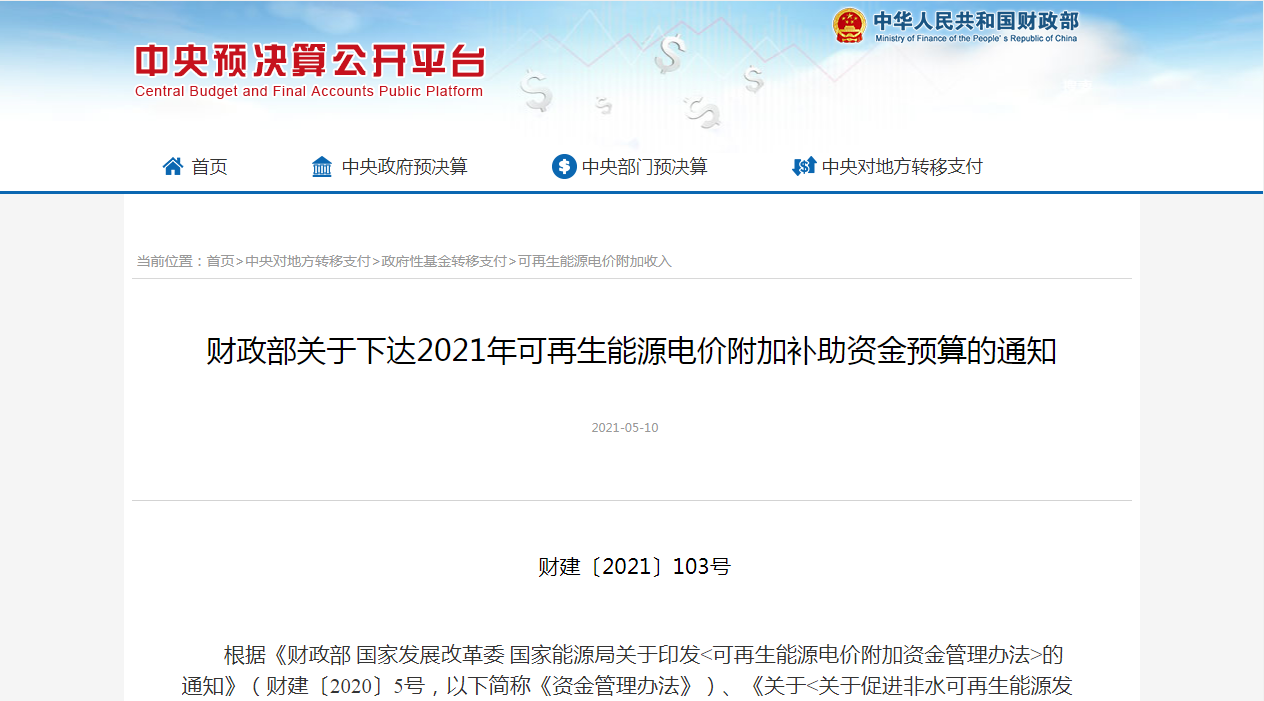 5月10日,財(cái)政部官網(wǎng)發(fā)布關(guān)于下達(dá)2021年可再生能源電價(jià)附加補(bǔ)助資金預(yù)算的通知。