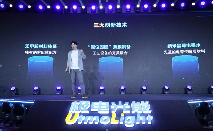發(fā)布會(huì)現(xiàn)場(chǎng),極電光能聯(lián)合創(chuàng)始人兼副總經(jīng)理鄭策博士首次對(duì)外發(fā)布了鈣鈦礦太陽(yáng)能組件“極創(chuàng)”整體解決方案,推出無(wú)甲胺鈣鈦礦材料體系、“原位固膜”薄膜制備技術(shù)和納米晶導(dǎo)電墨水三大技術(shù)創(chuàng)新,從材料制作、技術(shù)應(yīng)用、配方改進(jìn)等維度打造核心技術(shù)優(yōu)勢(shì),逐個(gè)攻破鈣鈦礦產(chǎn)業(yè)在效率提升、大面積制備以及穩(wěn)定性方面的行業(yè)痛點(diǎn),為鈣鈦礦商業(yè)化量產(chǎn)掃清障礙。