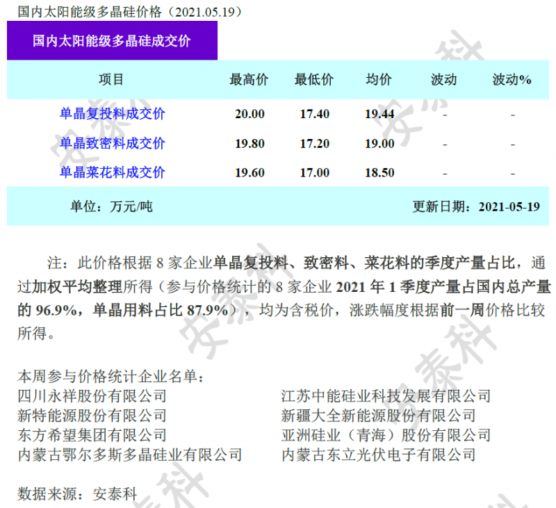 另一方面,硅料環(huán)節(jié)供不應(yīng)求仍是價格上漲的本質(zhì)因素,加之部分長單、散單比例調(diào)整,散單以相對高價成交,形成區(qū)間高價。因此,前期成交的低價本周漲幅較小而高價漲幅較大,導(dǎo)致本周多晶硅主流成交價區(qū)間拉大。