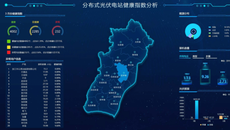 為此,國(guó)網(wǎng)溫州供電公司開展分布式光伏健康指數(shù)研發(fā),通過(guò)監(jiān)測(cè)全市范圍內(nèi)的光伏發(fā)電站發(fā)電量,結(jié)合裝機(jī)容量、安裝地域等因素,將年發(fā)電量和月發(fā)電量分別與理論值、平均值進(jìn)行比較,通過(guò)時(shí)監(jiān)測(cè)、日對(duì)比、周分析,研判光伏電站運(yùn)行工況。分析評(píng)價(jià)結(jié)果綠色代表“健康”,黃色代表“亞健康”,紅色代表“異!,最終出具詳細(xì)的診斷分析報(bào)告,輔助分布式光伏業(yè)主開展運(yùn)維管理。