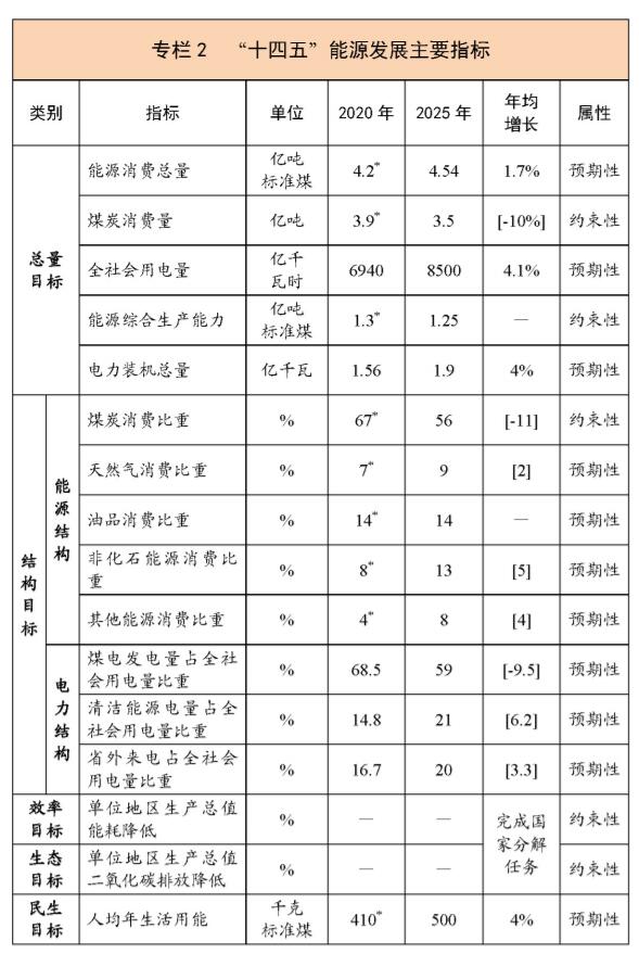 此外,《規(guī)劃》提出“十四五”的新能源發(fā)展主要目標。一是總量目標,能源消費總量控制在4.54億噸標準煤左右,煤炭消費量控制在3.5億噸左右。二是結構目標,煤炭消費比重下降到60%以內,非化石能源消費比重提高到13%左右。三是效率目標,完成國家下達的單位地區(qū)生產總值能耗降低目標。四是生態(tài)目標,完成國家下達的單位地區(qū)生產總值二氧化碳排放降低目標。五是民生目標,人均年生活用能達到500千克標準煤左右。