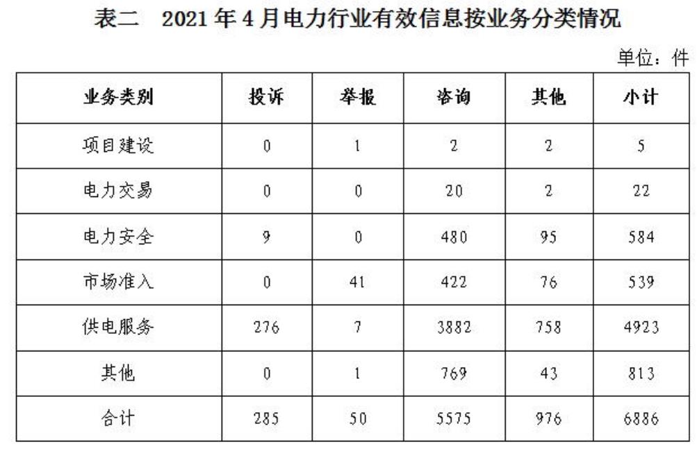據(jù)國家能源局官網(wǎng)消息:2021年4月,國家能源局12398能源監(jiān)管熱線共收到有效信息8697件,其中電力行業(yè)排在首位,有效信息數(shù)量為6886件,占全部有效信息的79.18%,主要集中于故障停電、電費交納等方面。石油天然氣行業(yè)排在第二位,有效信息數(shù)量為564件,占全部有效信息的6.48%。主要集中于居民燃?xì)庠O(shè)備故障、費用交納等方面。