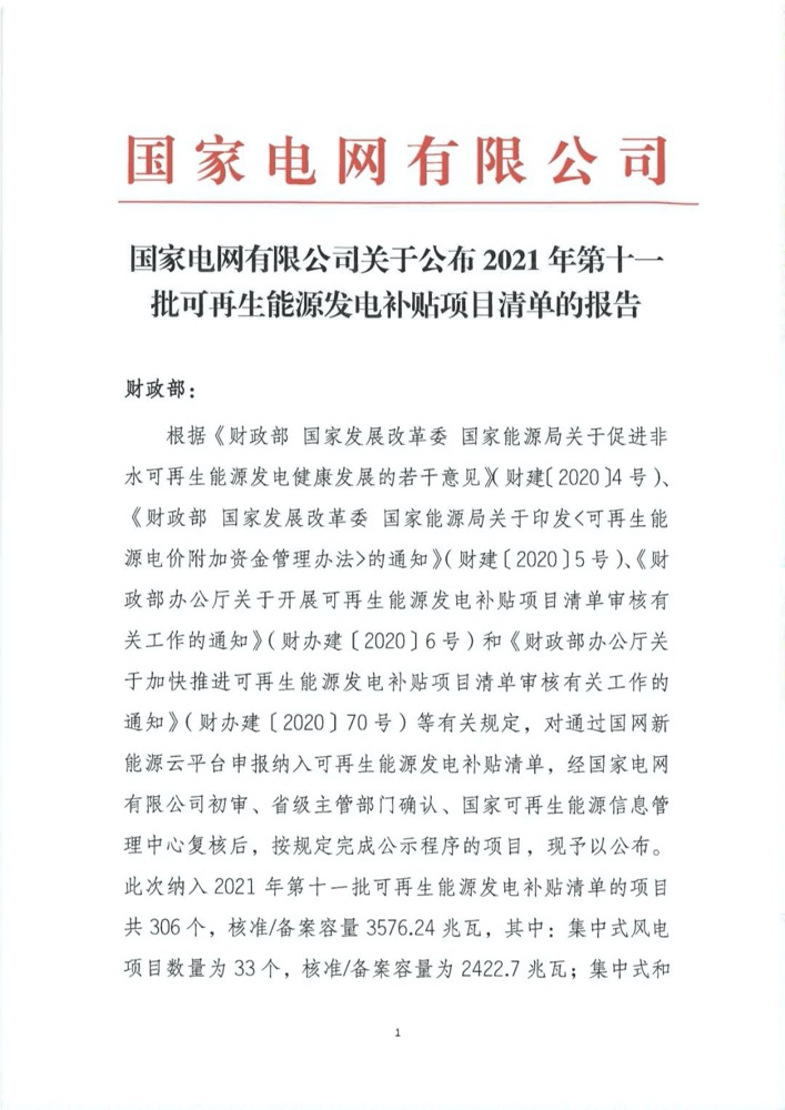 據(jù)國網(wǎng)新能源云今日公布的2021年第十一批可再生能源發(fā)電補(bǔ)貼項目清單,此次納入補(bǔ)貼項目清單的項目共306個,核準(zhǔn)/備案容量3576.24MW。