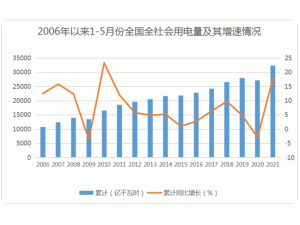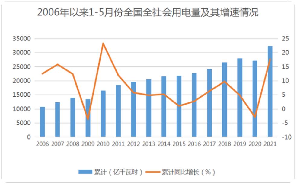 1-5月,全社會(huì)用電量累計(jì)32305億千瓦時(shí),同比增長(zhǎng)17.7%。分產(chǎn)業(yè)看,第一產(chǎn)業(yè)用電量362億千瓦時(shí),同比增長(zhǎng)21.6%;第二產(chǎn)業(yè)用電量21779億千瓦時(shí),同比增長(zhǎng)18.6%;第三產(chǎn)業(yè)用電量5483億千瓦時(shí),同比增長(zhǎng)27.8%;城鄉(xiāng)居民生活用電量4681億千瓦時(shí),同比增長(zhǎng)4.1%。