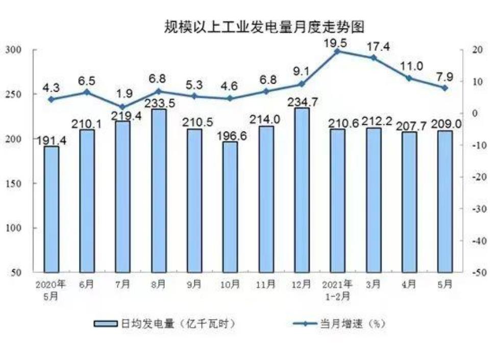 電力生產(chǎn)增速有所回落。5月份,發(fā)電6478億千瓦時(shí),同比增長(zhǎng)7.9%,比2019年同期增長(zhǎng)12.6%,兩年平均增長(zhǎng)6.1%,日均發(fā)電209億千瓦時(shí)。1—5月份,發(fā)電31772億千瓦時(shí),同比增長(zhǎng)14.9%,比2019年同期增長(zhǎng)11.3%,兩年平均增長(zhǎng)5.5%。