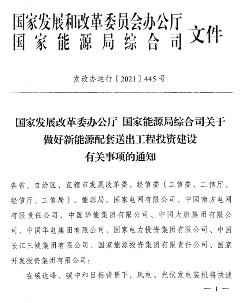 通知指出,碳達(dá)峰、碳中和目標(biāo)下,風(fēng)電、光伏將迎來快速增長,但電源送出工程成為制約新能源發(fā)展的重要因素。為加強電網(wǎng)和電源規(guī)劃的統(tǒng)籌協(xié)調(diào),優(yōu)先電網(wǎng)承建新能源配套送出工程, 確保送出工程與電源建設(shè)進(jìn)度相匹配。