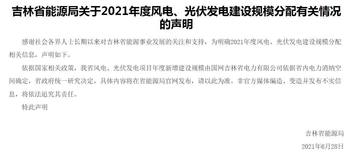 今日,吉林省能源局發(fā)布關(guān)于2021年度風(fēng)電、光伏發(fā)電建設(shè)規(guī)模分配有關(guān)情況的聲明指出:依據(jù)國家相關(guān)政策,吉林省風(fēng)電、光伏發(fā)電項目年度新增建設(shè)規(guī)模由國網(wǎng)吉林省電力有限公司依據(jù)省內(nèi)電力消納空間確定,省政府統(tǒng)一研究決定,具體內(nèi)容將在省能源局官網(wǎng)發(fā)布,請以此為準。非官方媒體編造、變造并發(fā)布不實信息,將依法追究其責(zé)任