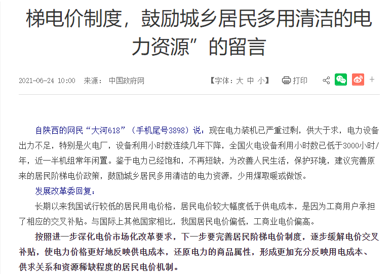 6月24日,中國政府網(wǎng)發(fā)布,發(fā)展改革委答網(wǎng)民關(guān)于“建議完善居民階梯電價制度,鼓勵城鄉(xiāng)居民多用清潔的電力資源”的留言。