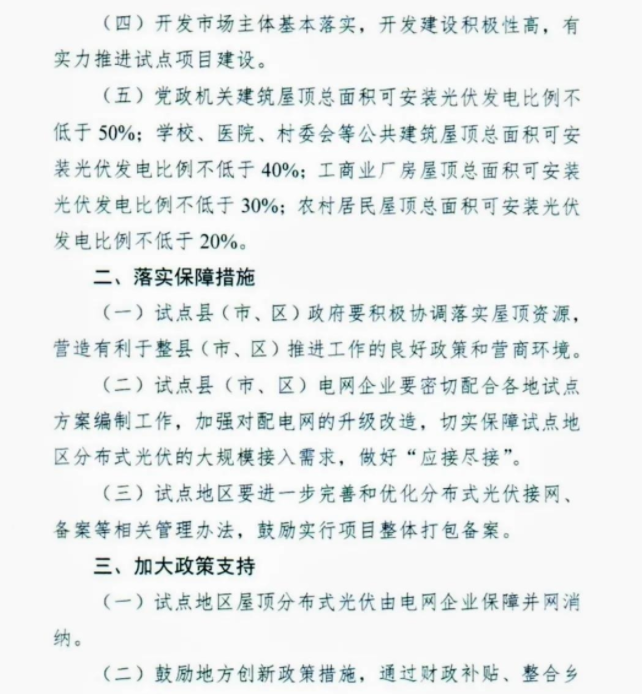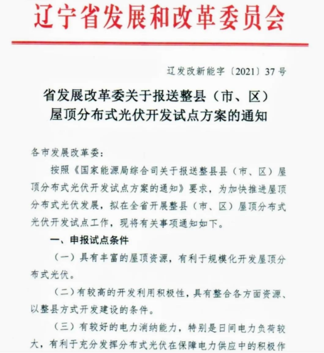 日前,遼寧省發(fā)改委印發(fā)通知,正式啟動(dòng)分布式光伏整縣推進(jìn)試點(diǎn)。通知明確,申報(bào)試點(diǎn)要具有豐富的屋頂資源,有較高積極性和較好電力消納能力,鼓勵(lì)項(xiàng)目整體打包備案,通過(guò)財(cái)政補(bǔ)貼、整合鄉(xiāng)村振興各類項(xiàng)目資金等方式給予支持。原則上每個(gè)市上報(bào)一個(gè)試點(diǎn)項(xiàng)目,每個(gè)試點(diǎn)項(xiàng)目確定一家項(xiàng)目業(yè)主,對(duì)消納條件好、市級(jí)支持政策條件優(yōu)、經(jīng)濟(jì)可行性