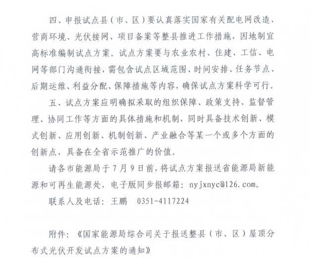 近日,山西省能源局下發(fā)關(guān)于報(bào)送整縣(市、區(qū))屋頂分布式光伏開發(fā)試點(diǎn)方案的通知,要求申報(bào)試點(diǎn)縣(市、區(qū))要認(rèn)真落實(shí)國(guó)家有關(guān)配電網(wǎng)改造、營(yíng)商環(huán)境、光伏接網(wǎng)、項(xiàng)目備案等整縣推進(jìn)工作措施,因地制宜高標(biāo)準(zhǔn)編制試點(diǎn)方案。通知強(qiáng)調(diào),試點(diǎn)方案要與農(nóng)業(yè)農(nóng)村、住建、工信、電網(wǎng)等部門溝通銜接,需包含試點(diǎn)區(qū)域范圍、時(shí)間安排、任務(wù)