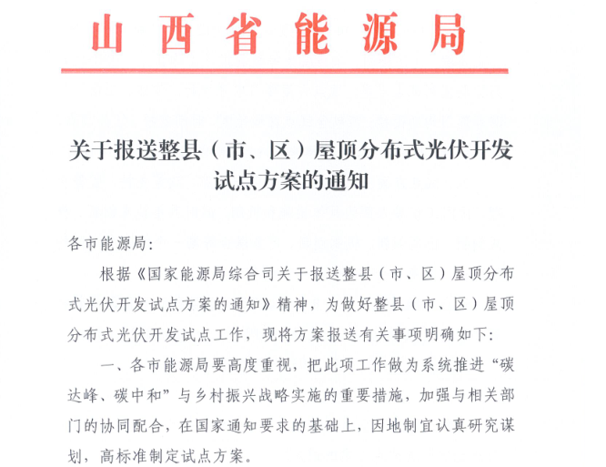 近日,山西省能源局下發(fā)關(guān)于報(bào)送整縣(市、區(qū))屋頂分布式光伏開發(fā)試點(diǎn)方案的通知,要求申報(bào)試點(diǎn)縣(市、區(qū))要認(rèn)真落實(shí)國(guó)家有關(guān)配電網(wǎng)改造、營(yíng)商環(huán)境、光伏接網(wǎng)、項(xiàng)目備案等整縣推進(jìn)工作措施,因地制宜高標(biāo)準(zhǔn)編制試點(diǎn)方案。