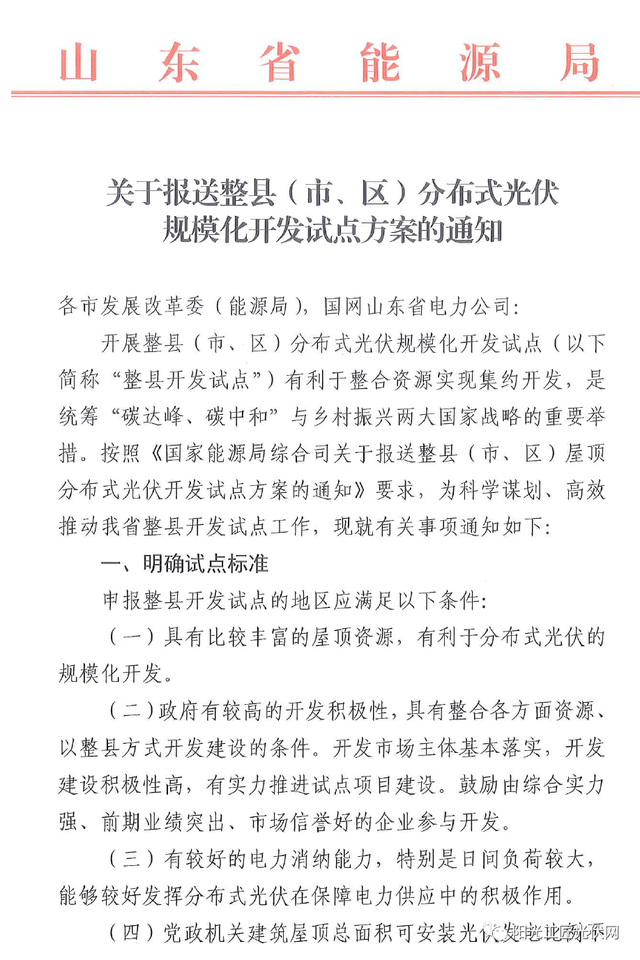 6月30日,山東省能源局正式下發(fā)《關(guān)于報(bào)送整縣(市、縣)分布式光伏規(guī);_發(fā)試點(diǎn)方案的通知》,截止日期為7月12日。