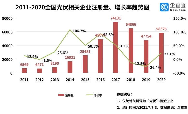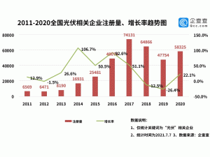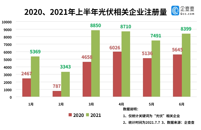 截至7月7日,今年我國共新增注冊(cè)光伏相關(guān)企業(yè)4.33萬家。與2020年上半年相比,今年上半年注冊(cè)總量同比上漲75%,1-6月的注冊(cè)量均領(lǐng)先去年。