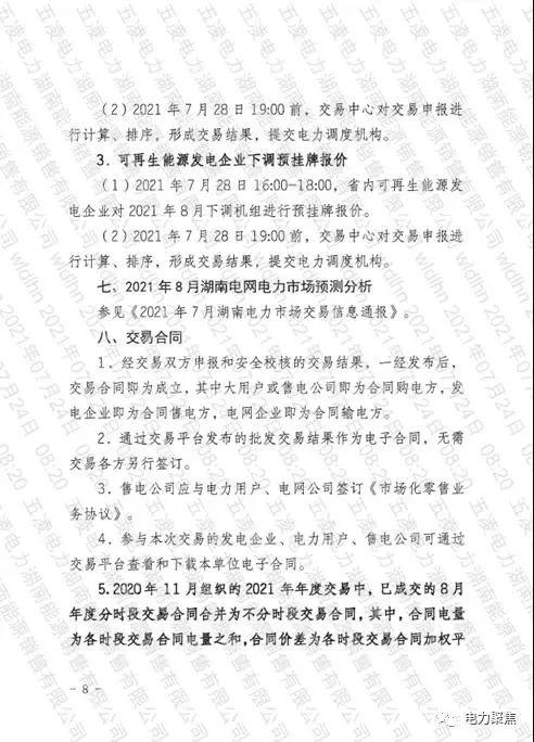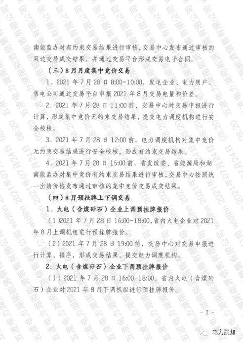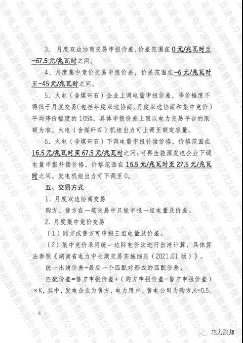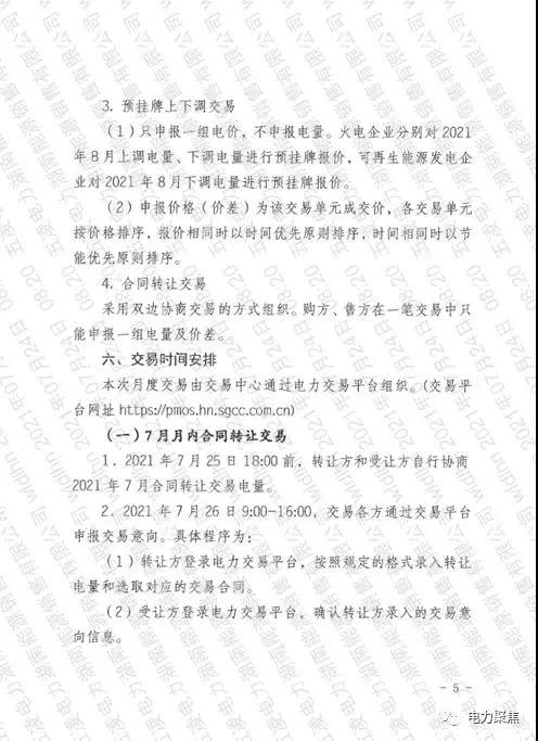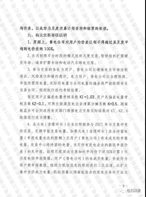 近日,湖南電力交易中心發(fā)布8月份交易公告,跟去年年底省發(fā)改委發(fā)布的《2021年湖南電力市場(chǎng)交易方案》(湘發(fā)改運(yùn)行[2020]907號(hào)文)相比,主要有以下四點(diǎn)變化:一是8月份交易仍按照不分時(shí)段模式組織月度交易,且暫停組織擴(kuò)需增發(fā)、風(fēng)電減棄擴(kuò)需、電動(dòng)汽車綠電專場(chǎng)交易;二是8月競(jìng)價(jià)交易最低申報(bào)價(jià)差由年度交易方案的-1.2分/千瓦時(shí)(8月為枯水期)調(diào)整為-0.6分/千瓦時(shí);三是水、火電下調(diào)補(bǔ)償申報(bào)價(jià)格分別由最高的13.5分/千瓦時(shí)、5.5分/千瓦時(shí)調(diào)整為6.75分/千瓦時(shí)、2.75分/千瓦時(shí);四是火電上調(diào)報(bào)價(jià)由月度交易平均降幅的120%調(diào)整為105%。
