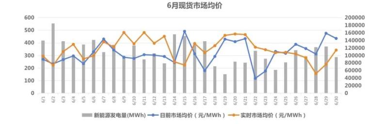 在甘肅省6月結(jié)算試運行期間,日前市場平均出清價格319元/MWh,實時市場平均出清價格348元/MWh,日前市場和實時市場的出清均價較5月明顯升高(300/274元/MWh)。但5、6月份甘肅的現(xiàn)貨試運行結(jié)果反映出,甘肅現(xiàn)貨市場實時價格與日前市場價格越來越不耦合。